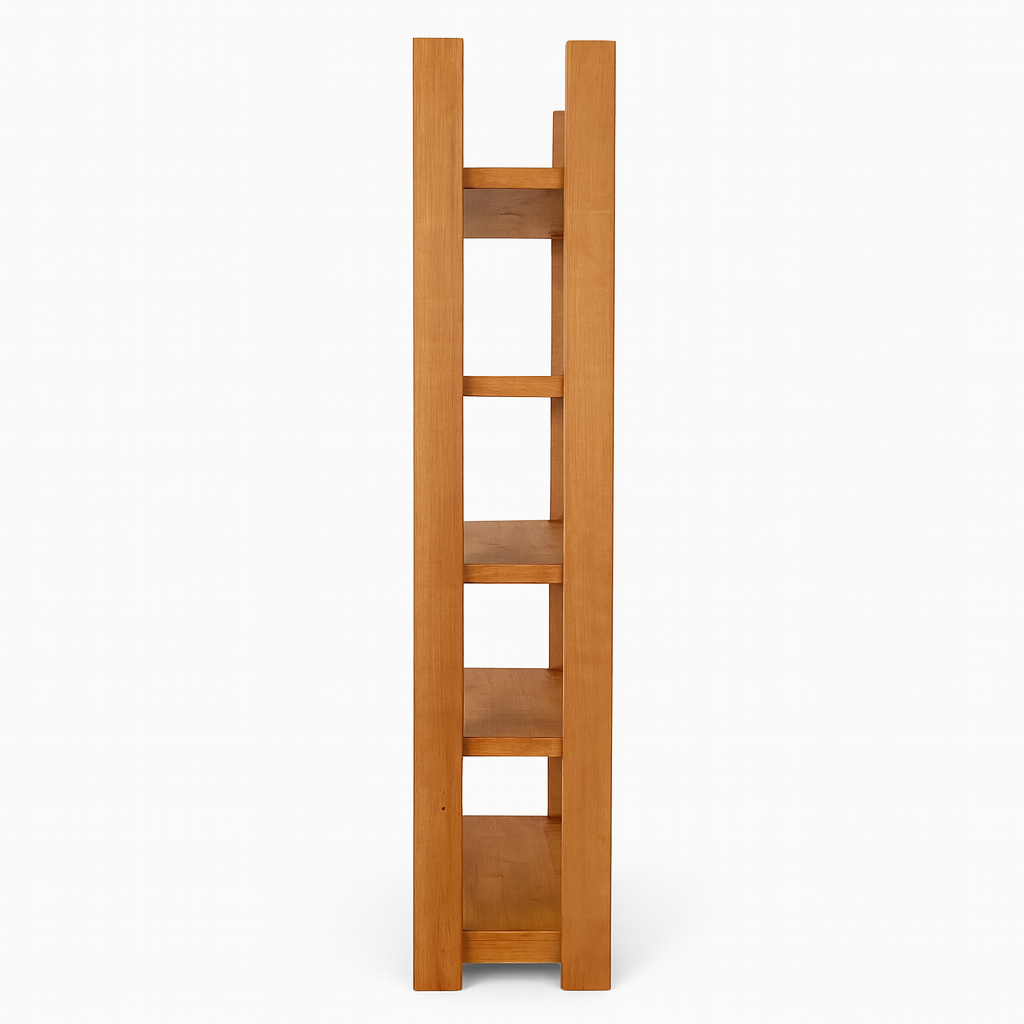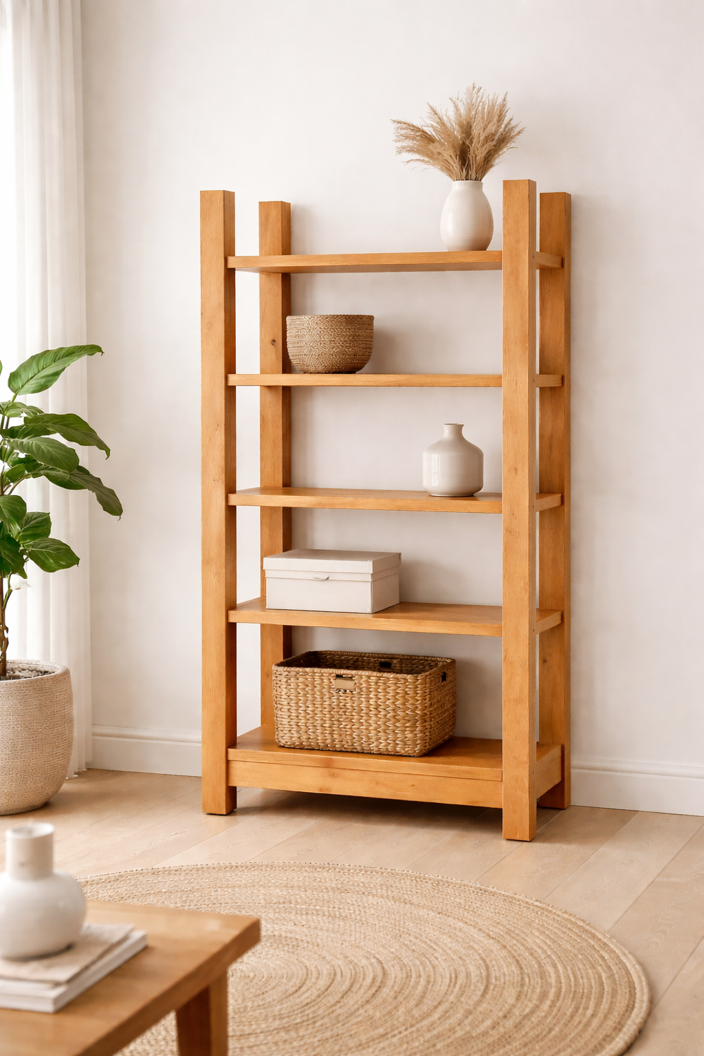 Atlas nace como una estructura rotunda y sincera. Su silueta vertical y sus proporciones generosas la convierten en una pieza protagonista, ideal para ambientes donde el mobiliario define la atmósfera. Con cinco niveles de almacenaje y un carácter casi arquitectónico, esta estantería transforma el almacenaje en una declaración visual.