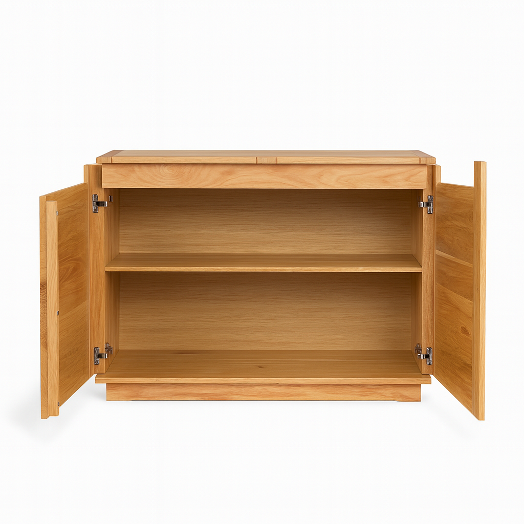 Sus dos puertas esconden un amplio espacio de almacenaje con balda interior, ideal para vajillas, libros, textiles o tecnología doméstica. Su diseño neutro y robusto permite convivir tanto con ambientes minimalistas como con estilos más clásicos o eclécticos.