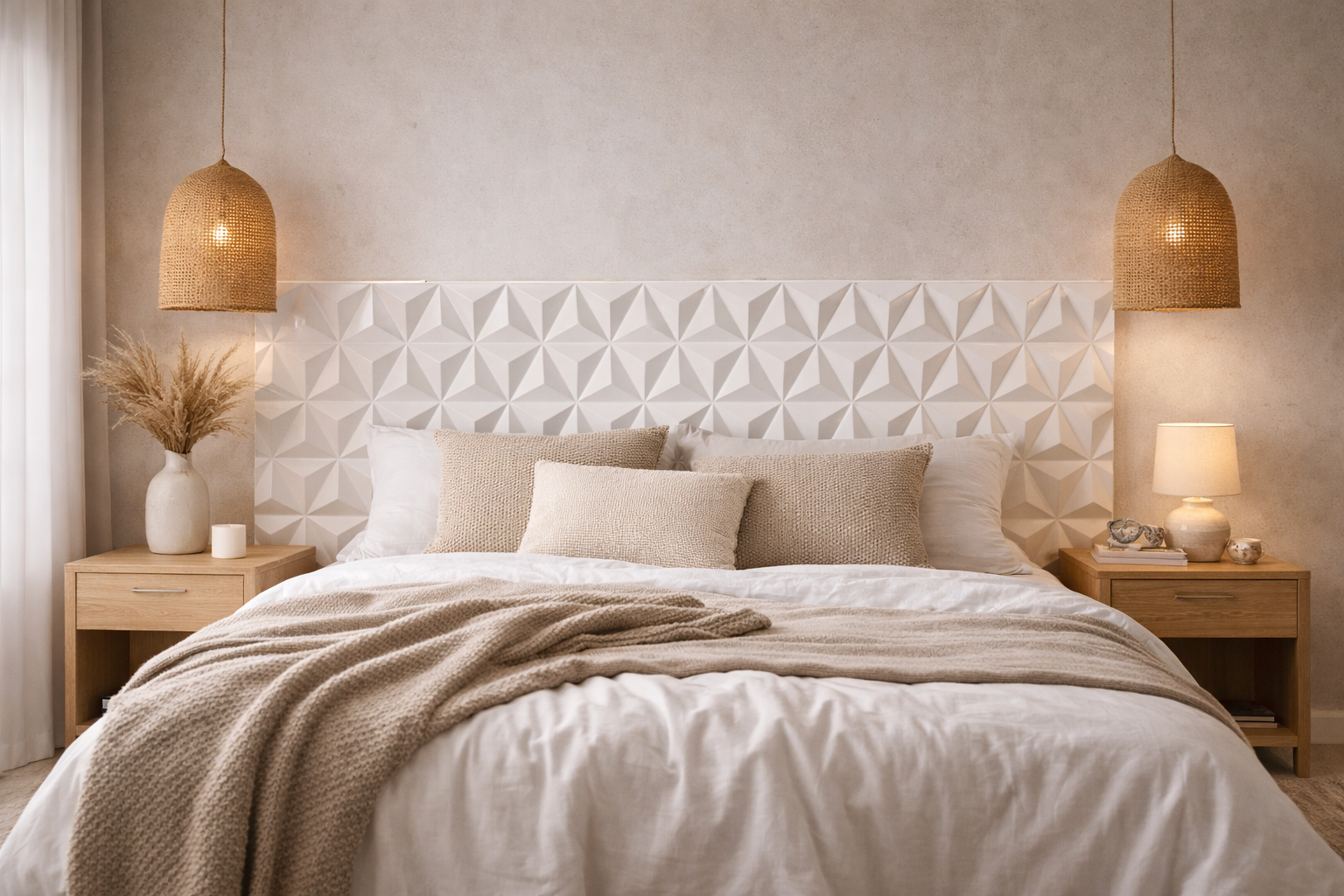 El cabecero Facetado Blanco transmite ligereza, orden y calma. Es una invitación al descanso visual, una textura envolvente que transforma el dormitorio en un refugio estético y táctil.