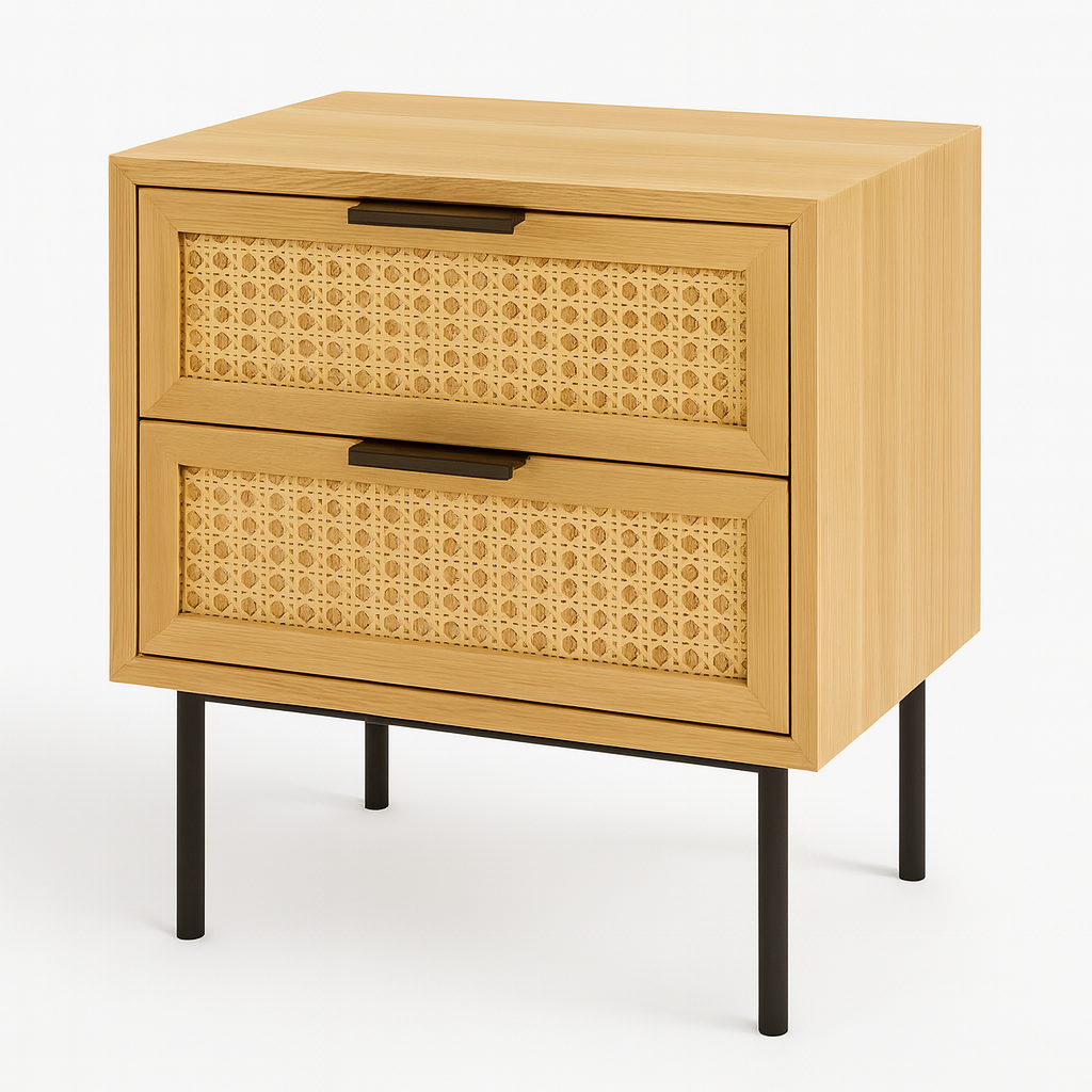 Gardenia nace del deseo de fusionar ligereza visual y calidez natural. Su silueta cúbica y contenida descansa sobre una estructura elevada de acero que aporta equilibrio y ligereza. Los frentes enrejados evocan técnicas artesanales ancestrales mientras su cuerpo geométrico dialoga con interiores modernos y mediterráneos.