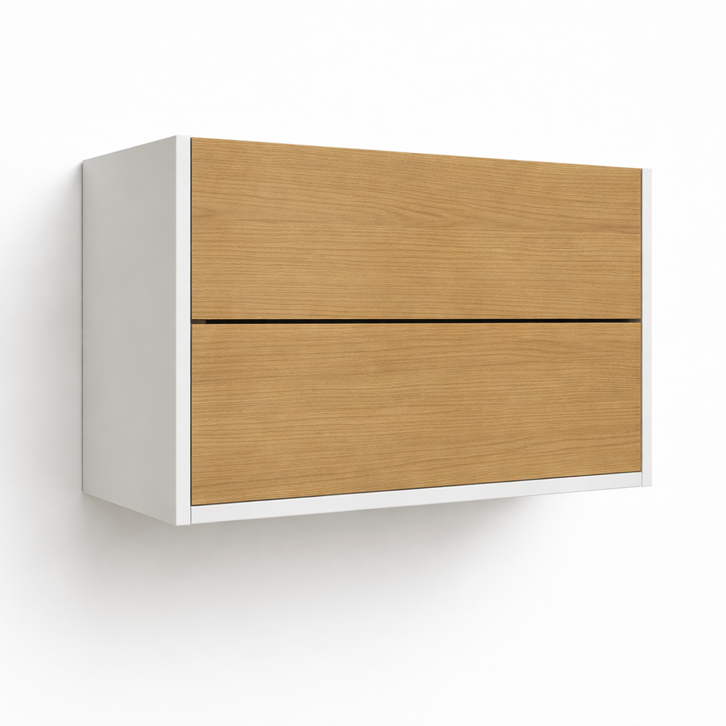 Cidacos combina proporciones limpias con un diseño estructural sólido. Diseñado para baños que equilibran serenidad y funcionalidad. La silueta suspendida genera una sensación visual de amplitud, mientras que su frente de madera aporta calidez y textura al conjunto. Ideal para quienes valoran la claridad estética sin renunciar al almacenamiento.