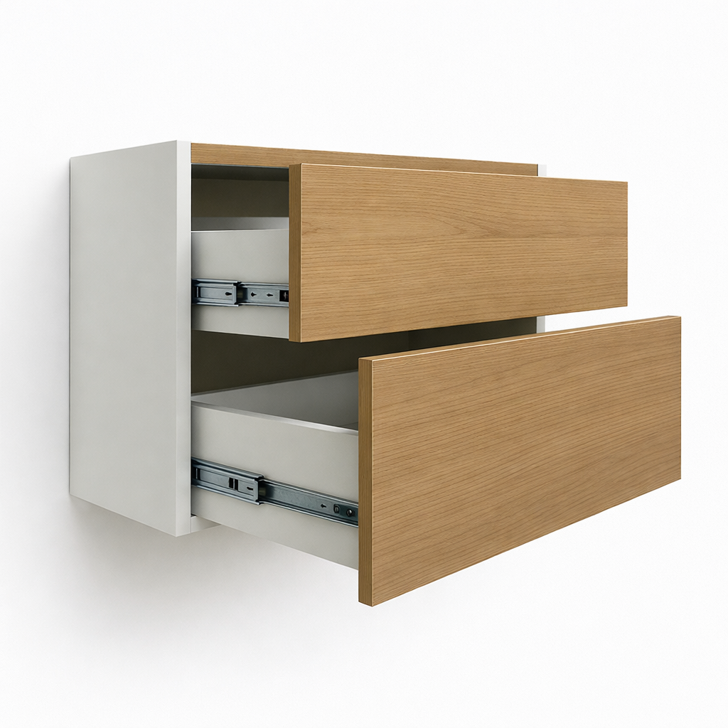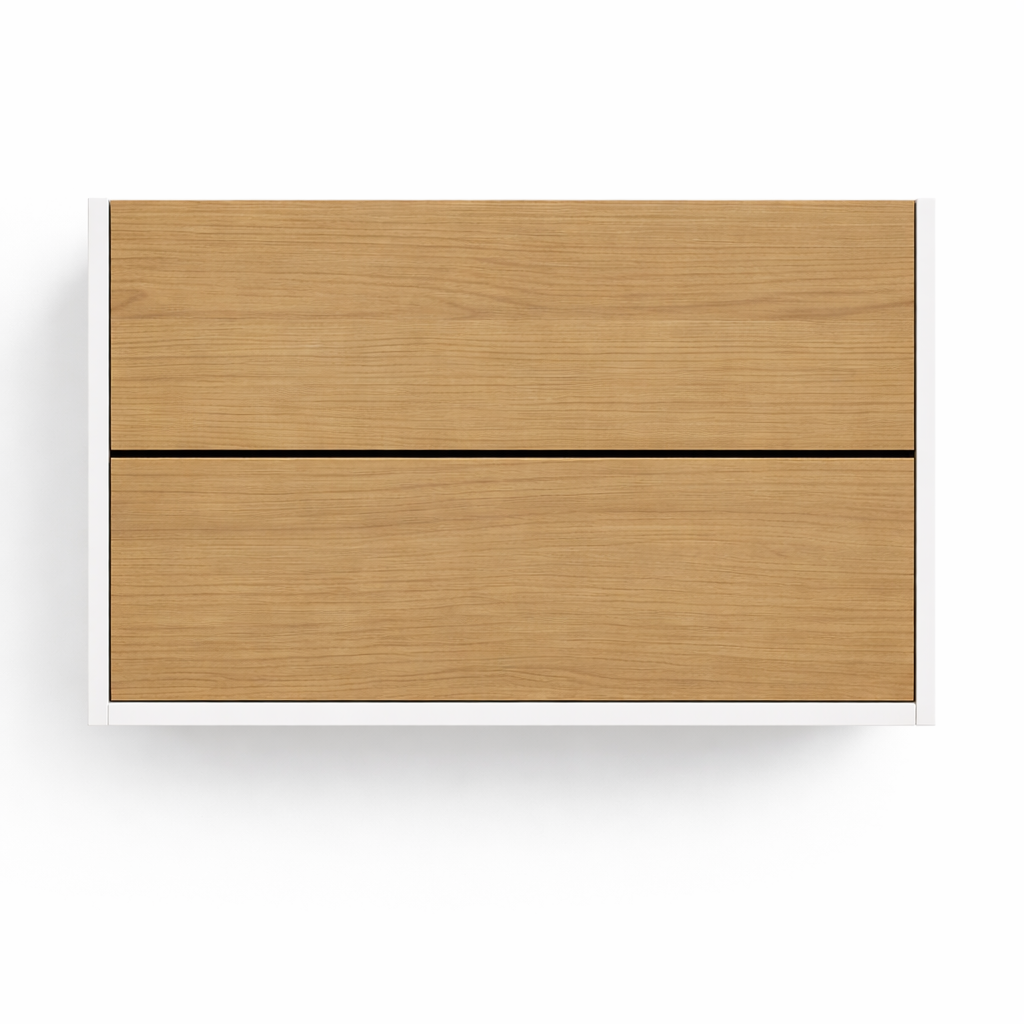 Pensado para baños con lavabos sobre encimera. Cidacos cuenta con dos amplios cajones que optimizan el orden sin saturar el espacio. Su forma compacta permite integrarse fácilmente en baños pequeños o medianos, elevando la estética sin invadir.