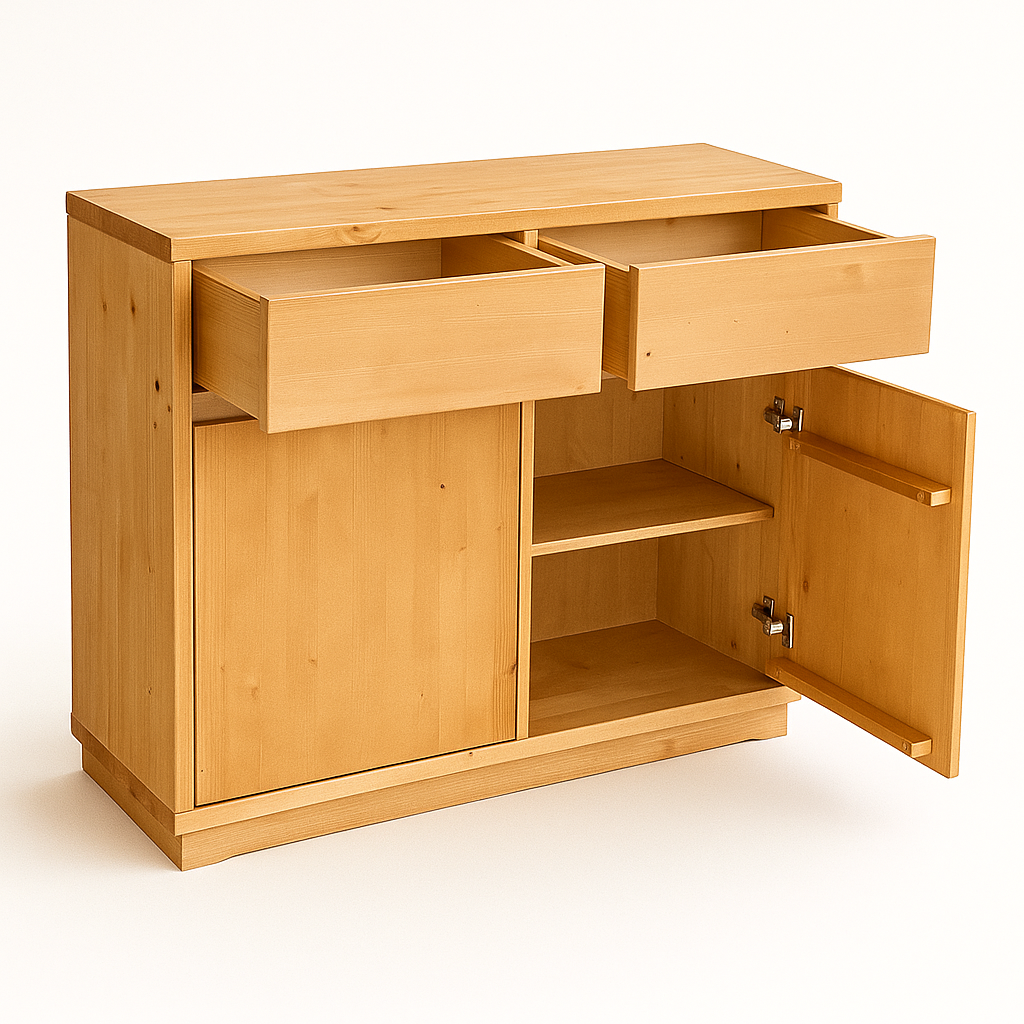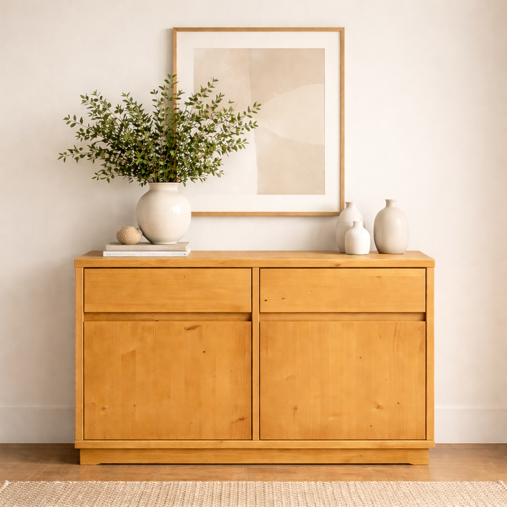 Ideal como aparador bajo en espacios interiores, especialmente donde se desea aportar luz y suavidad. Su altura permite utilizarlo también como apoyo para lámparas, cerámicas o composiciones decorativas. La división interior, con baldas ajustables, permite adaptarlo a distintos usos, desde menaje hasta documentos o textiles.