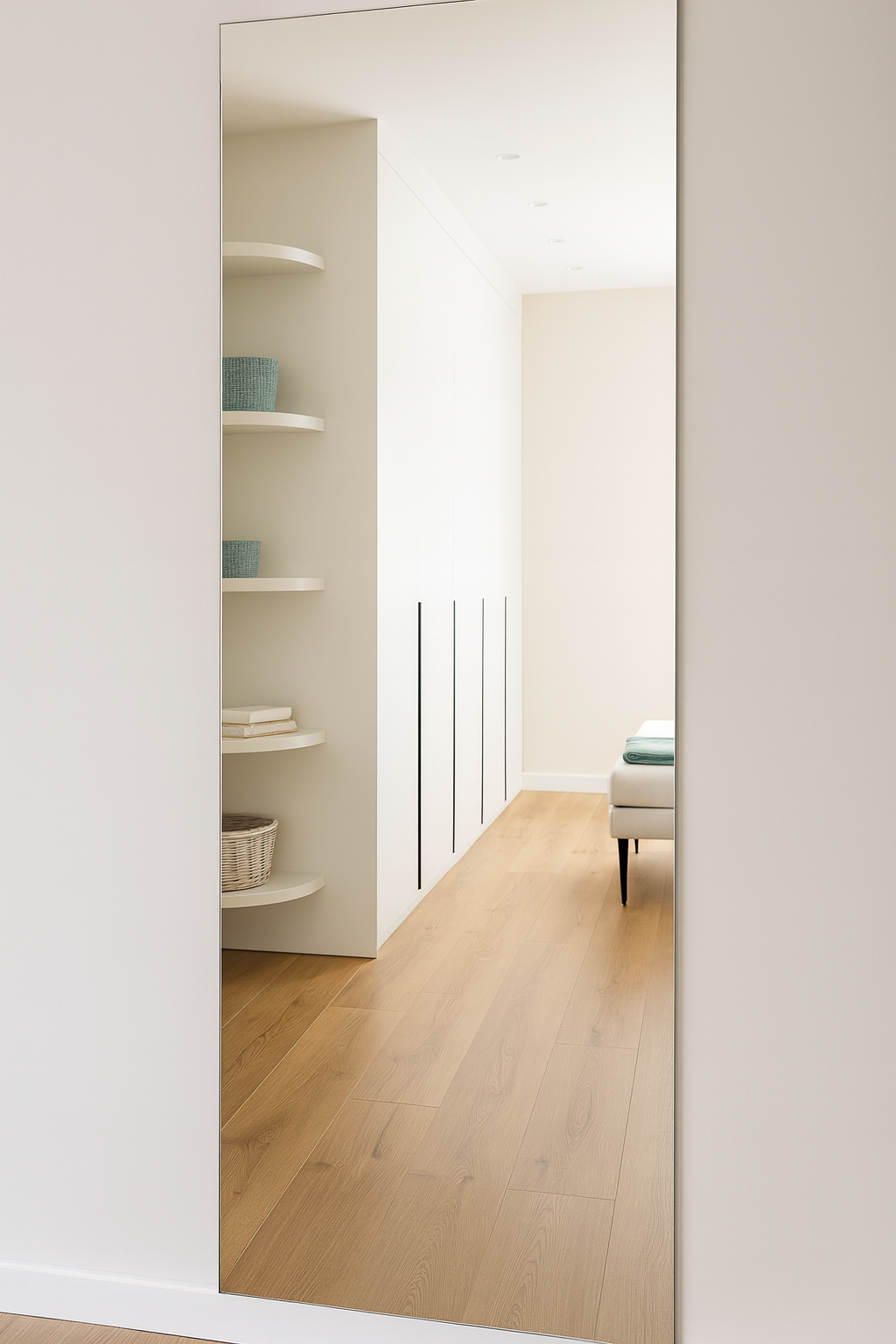 Su formato alargado permite una visión de cuerpo entero, ideal para dormitorios, vestidores o recibidores. Además de su función práctica, aporta luminosidad y sensación de amplitud a las estancias, potenciando la estética minimalista y sofisticada de cualquier espacio.