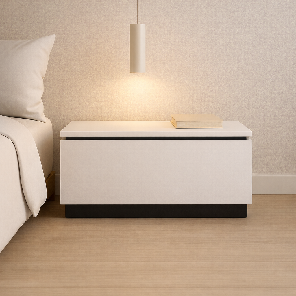 Prímula nace como una reinterpretación contemporánea de la mesita de noche clásica. Su formato bajo y alargado, casi escultórico, propone una estética minimalista sin perder funcionalidad. Pensada para espacios sobrios y serenos, se integra con discreción pero deja una huella visual firme.
