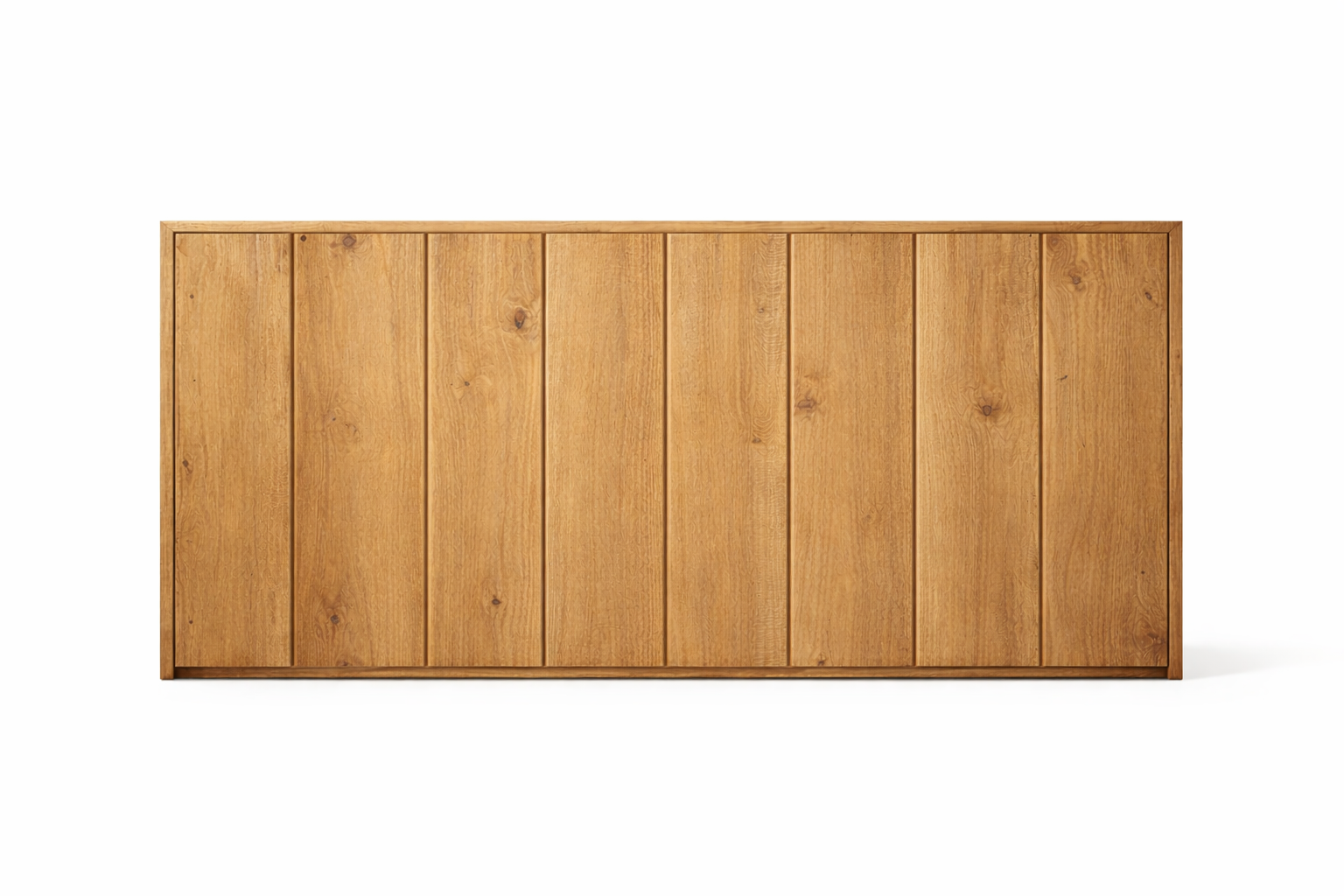 Rústico Natural nace de la búsqueda de lo elemental. Una pieza que no pretende ser protagonista, pero cuya presencia ordena, acoge y da estructura. Su diseño se compone de tablones verticales lisos, enmarcados por una moldura perimetral limpia que encierra y resalta la calidez del material. Es un gesto sereno, de líneas puras y sin artificio.