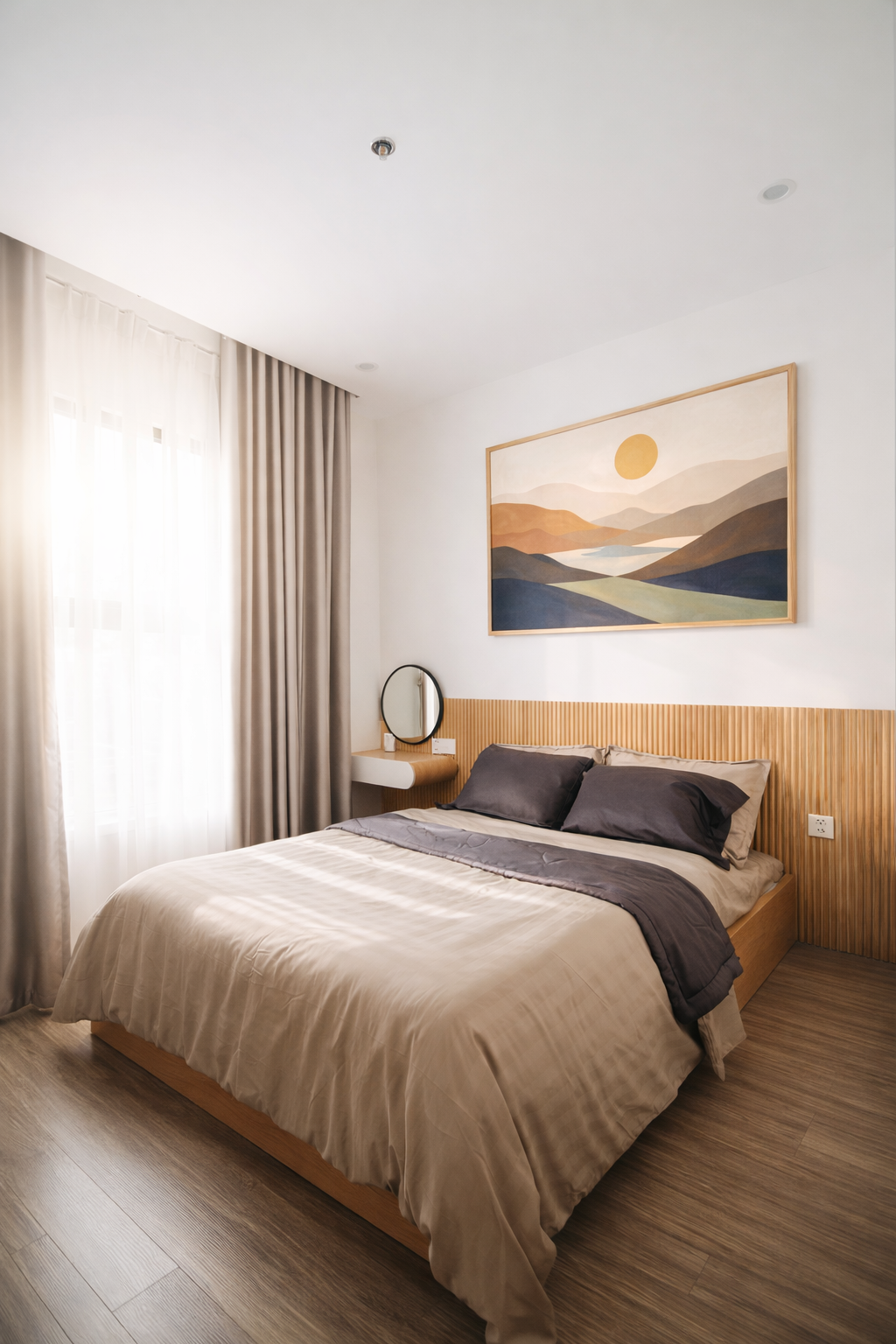 Ideal para dormitorios luminosos, de estética mediterránea, nórdica o japandi. Sereno madera combina especialmente bien con textiles naturales, tonos arena, lino o blanco roto, así como con suelos de madera o microcemento. Su capacidad para extenderse horizontalmente lo convierte también en un recurso ideal para revestir una pared completa o generar un cabecero envolvente.