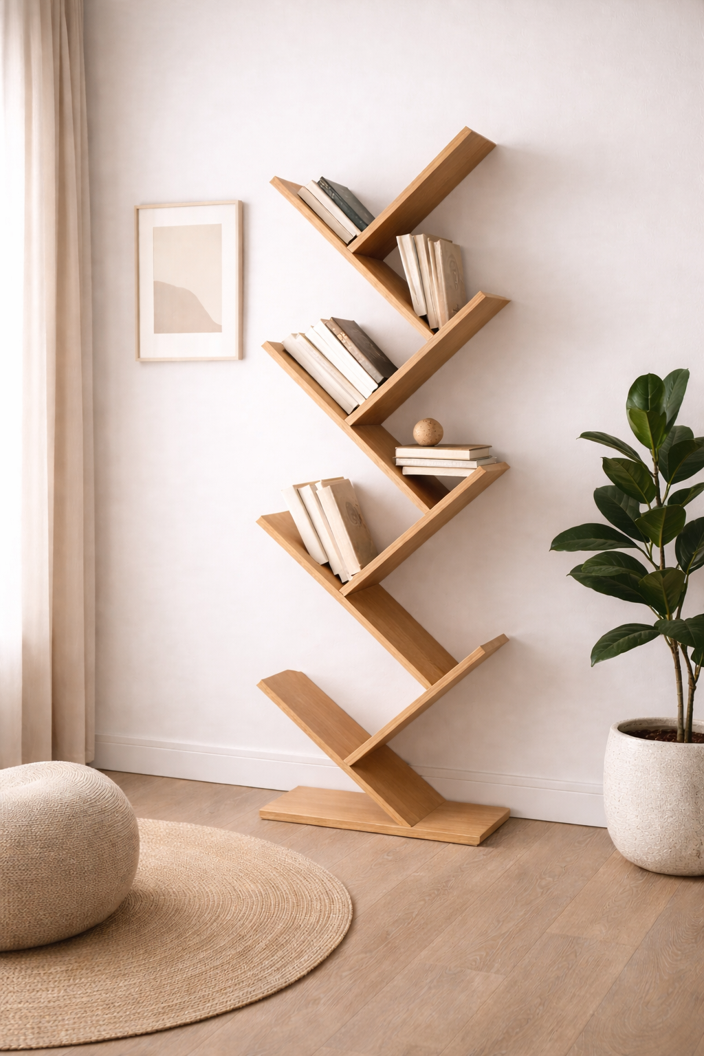 Tindaya es ideal como estantería de lectura en salones, dormitorios o estudios. Aporta carácter sin recargar y permite visualizar el lomo de cada libro de forma clara. También es apta para objetos decorativos, catálogos o revistas.